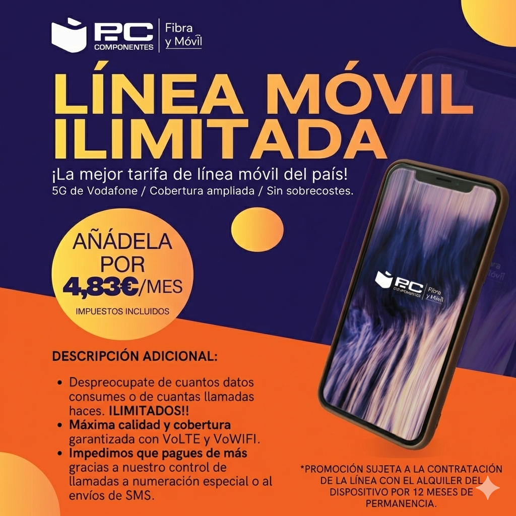 Esta línea móvil forma parte del ecosistema PcComponentes Fibra y Móvil, nuestra operadora propia. Utiliza la red Vodafone para garantizar cobertura y calidad en todo el territorio, con una tarifa estable pensada para el uso real del día a día.
